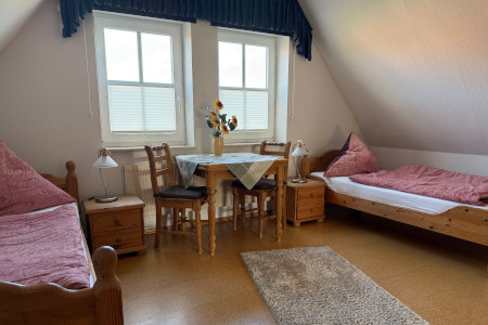 OG Schlafzimmer 1: Zwei Einzelbetten, Farb-Sat-TV, Tisch mit Bestuhlung, Jalousien.