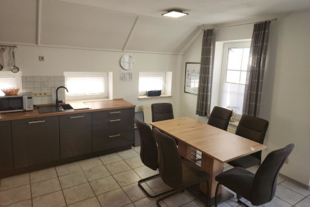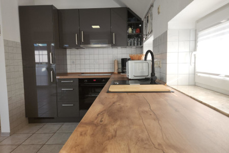 Küche: Backofen, Induktionskochfeld, Geschirrspülmaschine, Kühlschrank, kleiner Gefrierschrank, Kaffeemaschine, Mikrowelle, Wasserkocher, Topfrondell