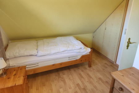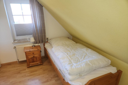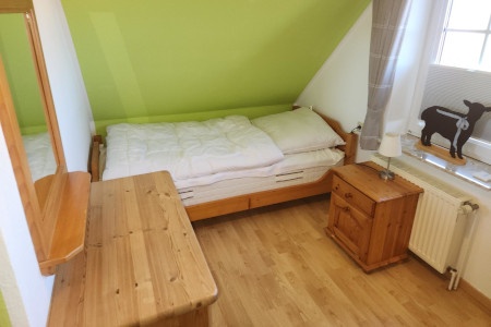 Schlafzimmer 2: 2 Einzelbetten, Nachttische mit Lampen, Spiegel, Kommode, 2-türiger Eckkleiderschrank