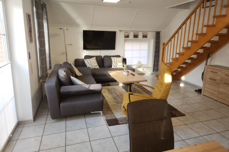 Wohnzimmer mit 2 Couchgarnituren, Holztisch, Relaxsessel, Flachbildfernseher, Essecke mit Holztisch zum Ausziehen und 6 Stühlen, Treppe zum OG aus Holz