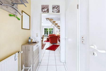Abstellraum mit Bügelbrett, Bügeleisen, Staubsauger, Reigungsutensilien.