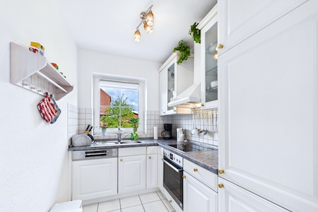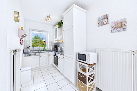 Küche: Backofen mit Ceran-Kochfeld, Geschirrspüler, Toaster, Kühlschrank mit Eisfach, Wasserkocher, Eierkocher, Mikrowelle, Kaffeemaschine, Tassimo, Topfrondell, Hochstuhl