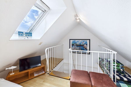 Schlafraum: 2 Einzelbetten niedrige Höhe, Nachttischchen mit Lampen, Stereoanlage, Fernseher, kleiner Hocker
