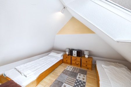 Schlafzimmer 1: 2 Einzelbetten, Kleiderschrank, Regal mit Spielen, Tisch mit Stuhl, Vorhänge und Plissee
